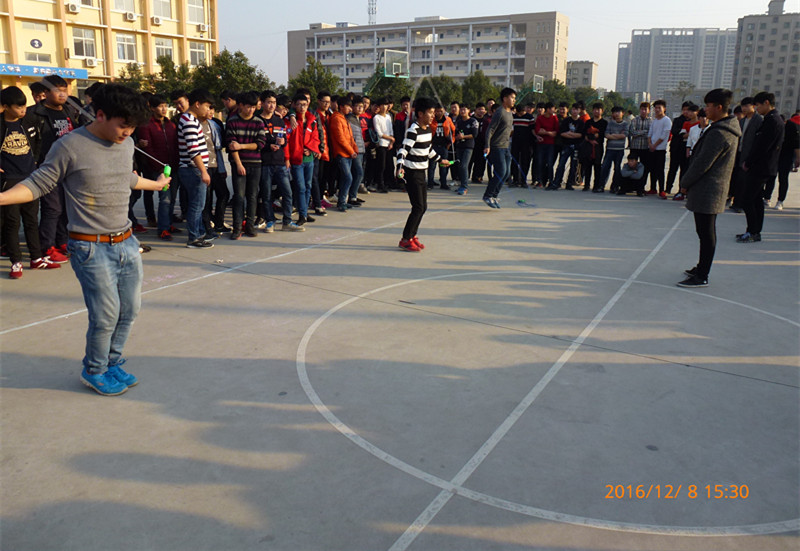 为了丰富校园文化活动生活,增强班级集体荣誉感,增进同学之间的友谊和团结意识 。我系特举办“学生跳绳比赛”。 本次比赛是以各班为单位,经抽签进行循环赛。同时在本次比赛的筹办过程中,学院也给予了我们大力支持,使得赛场上洋溢着更加饱满的热情!体现出了我校学生的团结合作意识!