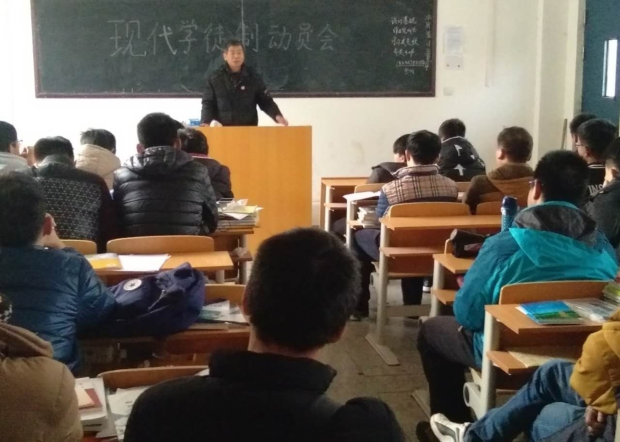 2017年元月3日下午,在高新校区教学楼107教室,新能源汽车学院领导组织召开了汽车工程系汽车检测与维修专业和新能源汽车技术专业学生参加现代学徒制试点项目动员大会。