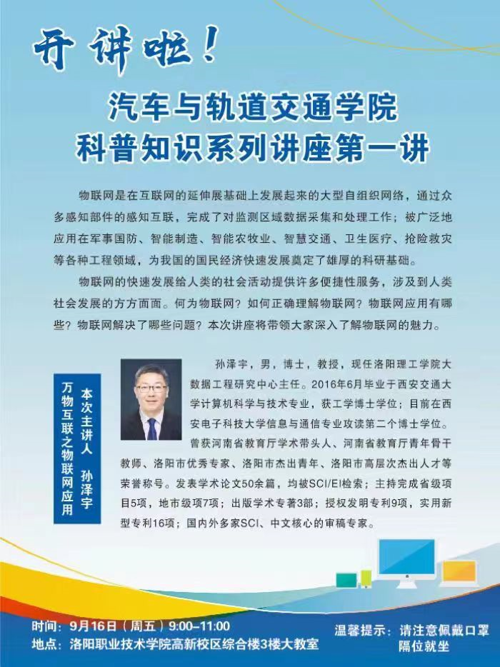 展洛职风采、现青春活力、相约开学季、丰学知生活,2022年9月16日上午,结合汽车专业特点,加强学生对物联网发展趋势、应用现状、网络安全教育等深刻认识,我院诚邀洛阳理工学院大数据工程研究中心主任孙泽宇教授开展物联网科普讲座。