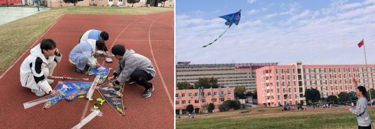 在高新校区田径场上,同学们拉着风筝在操场上尽情奔跑,挥洒着青春的汗水。蔚蓝的天空中飞满了形态各异的风筝,有三角形、正方形,还有企鹅、老鹰等图案。有的同学十分熟练,很快将风筝升空,有的同学应该是第一次接触,但经过不断摸索,最终风筝都飞了起来。放风筝能使同学们情绪开朗、心境愉悦。放飞时,大脑高度集中,会消除内心杂念;放飞时,极目蓝天,心胸开阔。此外,草长莺飞,触目皆景,放飞风筝,是同学们与自然的一次美好对话。