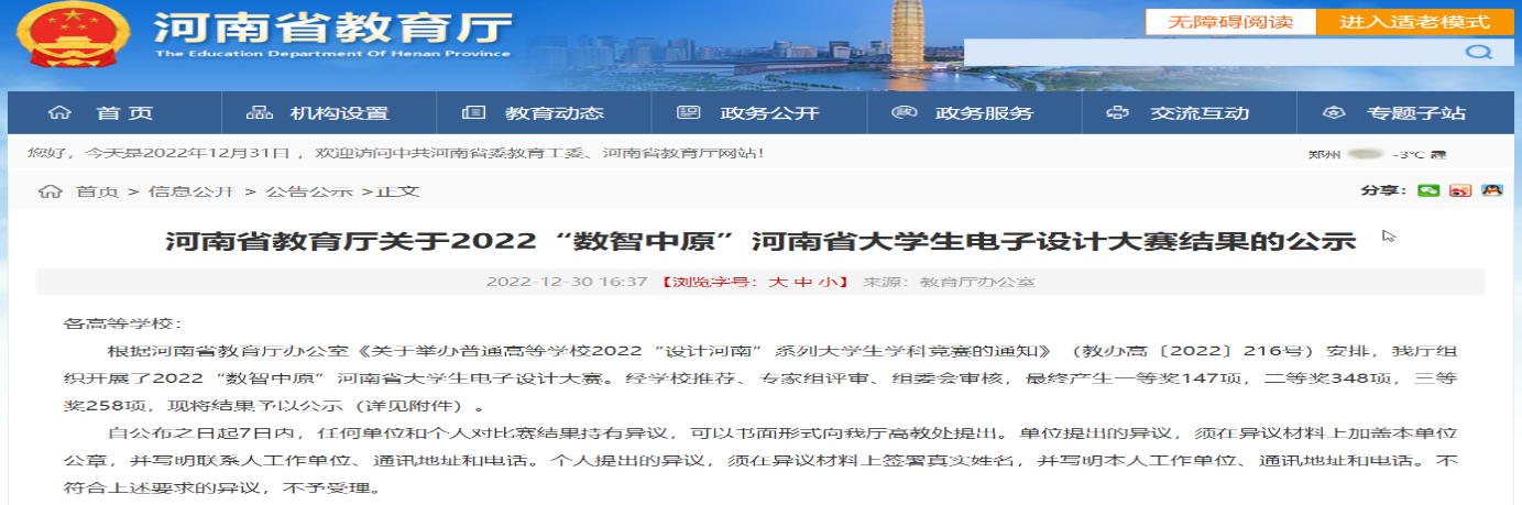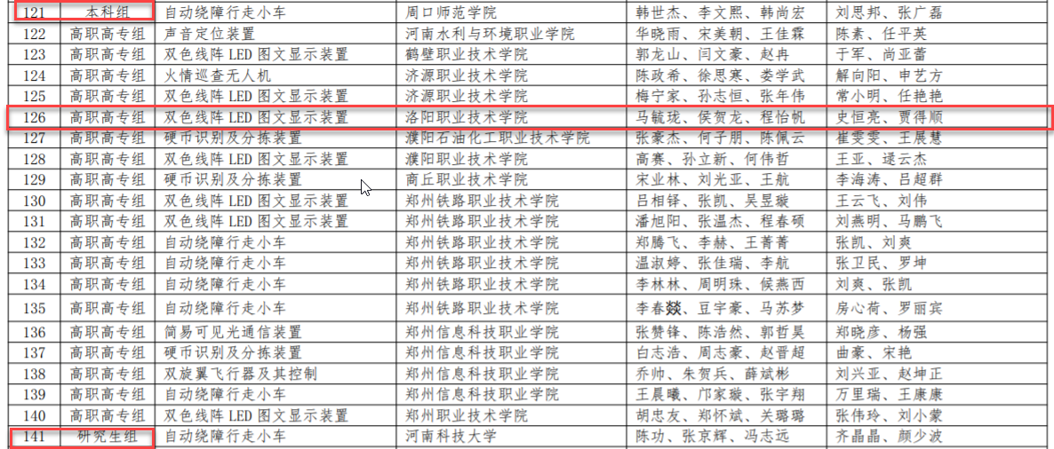 2022“数智中原”河南省大学生电子设计大赛由河南省教育厅主办,大赛为贯彻落实省委、省政府关于“设计河南”建设的战略部署,持续深化教育教学改革,加快培养卓越设计人才,打造设计创新中心和人才高地,通过动员、吸引、鼓励广大高校积极参与,进一步培养学生电子信息类及相关交叉学科大学生电子系统的设计能力,提高大学生对工程问题分析的分析能力和创新创意设计综合能力。大赛共分单相逆变并网模拟装置、双输出DC/DCDC/AC变换器、自动绕障行走小车、双色线阵LED图文显示装置等10个题目,设有高职高专、本科、研究生三个组,经学校推荐、专家组评审、组委会审核,最终产生一等奖147项,二等奖348项,三等奖258项。