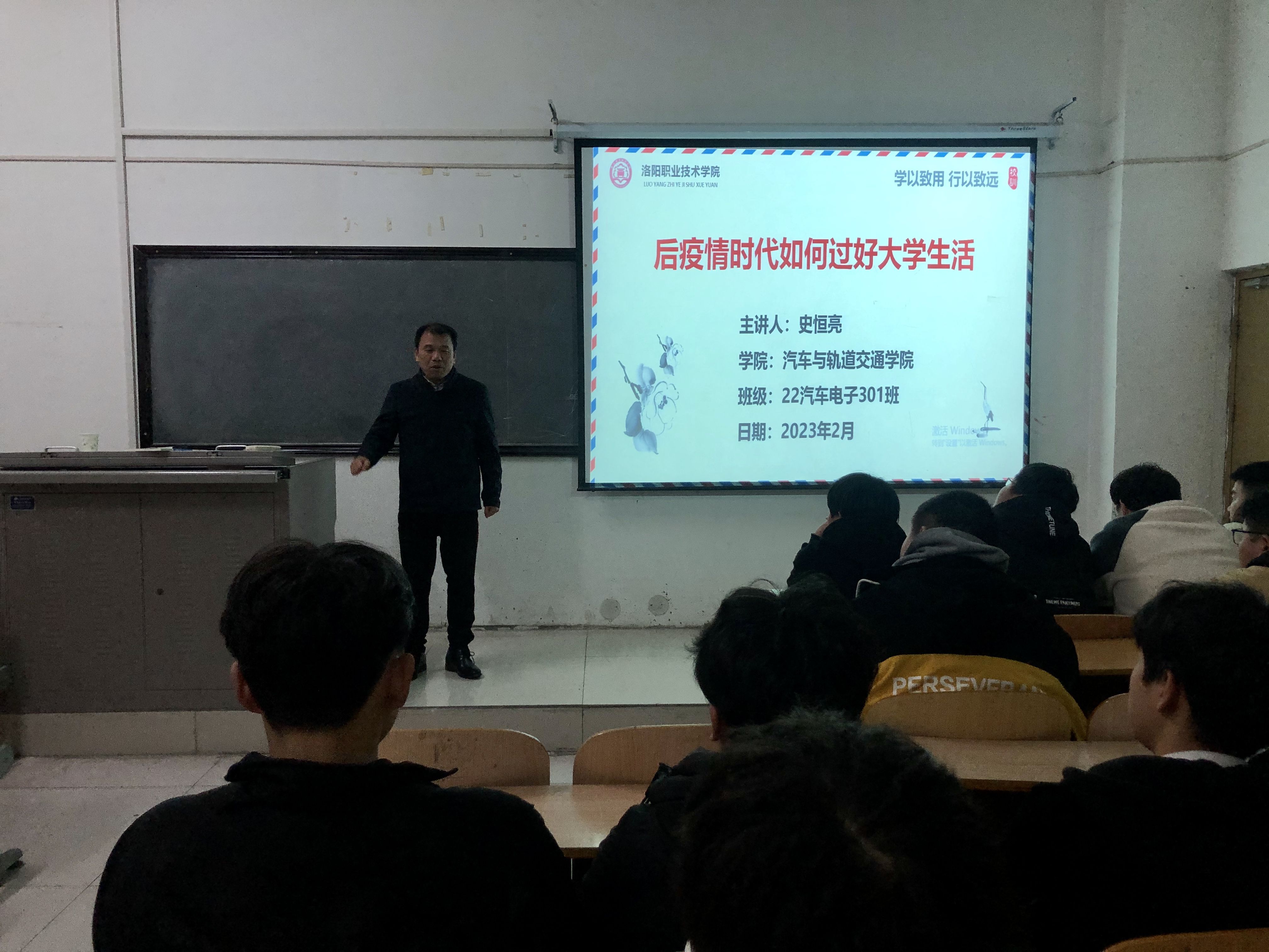 为了帮助学生快速适应后疫情时代下大学生活,2月16日晚上,在综合楼107教室,汽车与轨道交通学院院长史恒亮为22汽车电子301班讲授开学第一课。