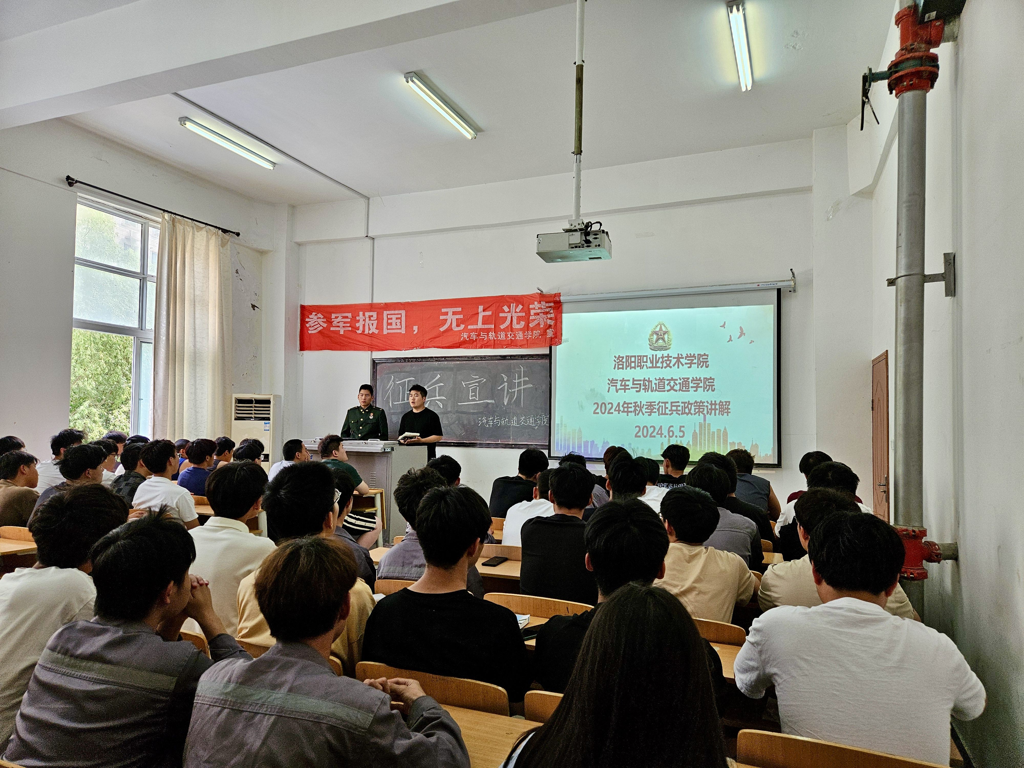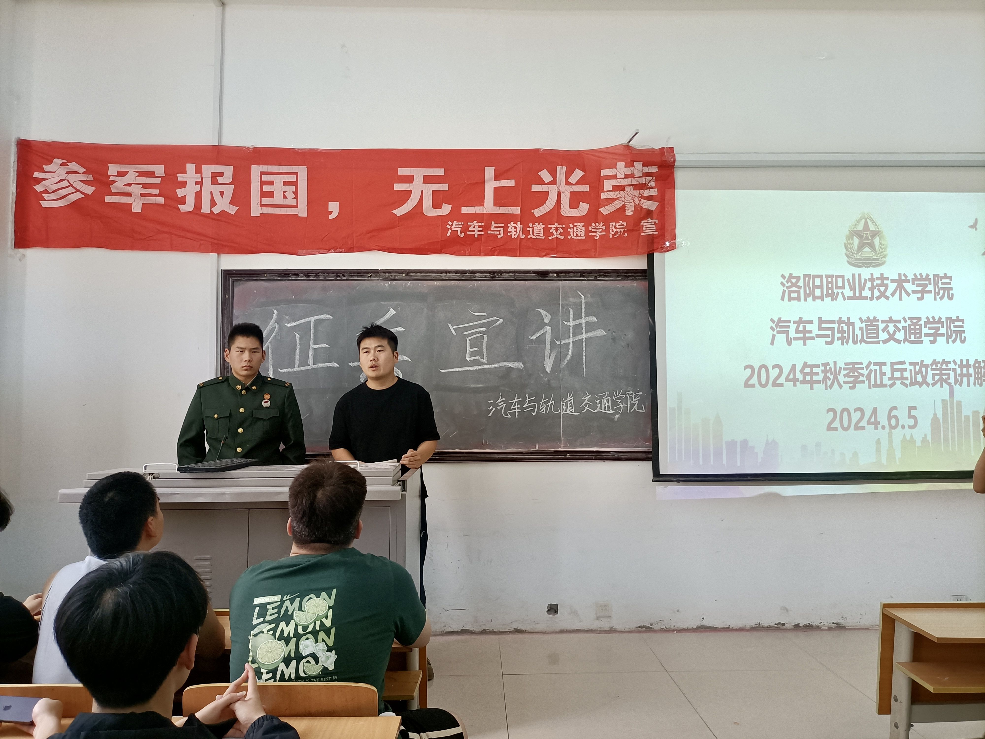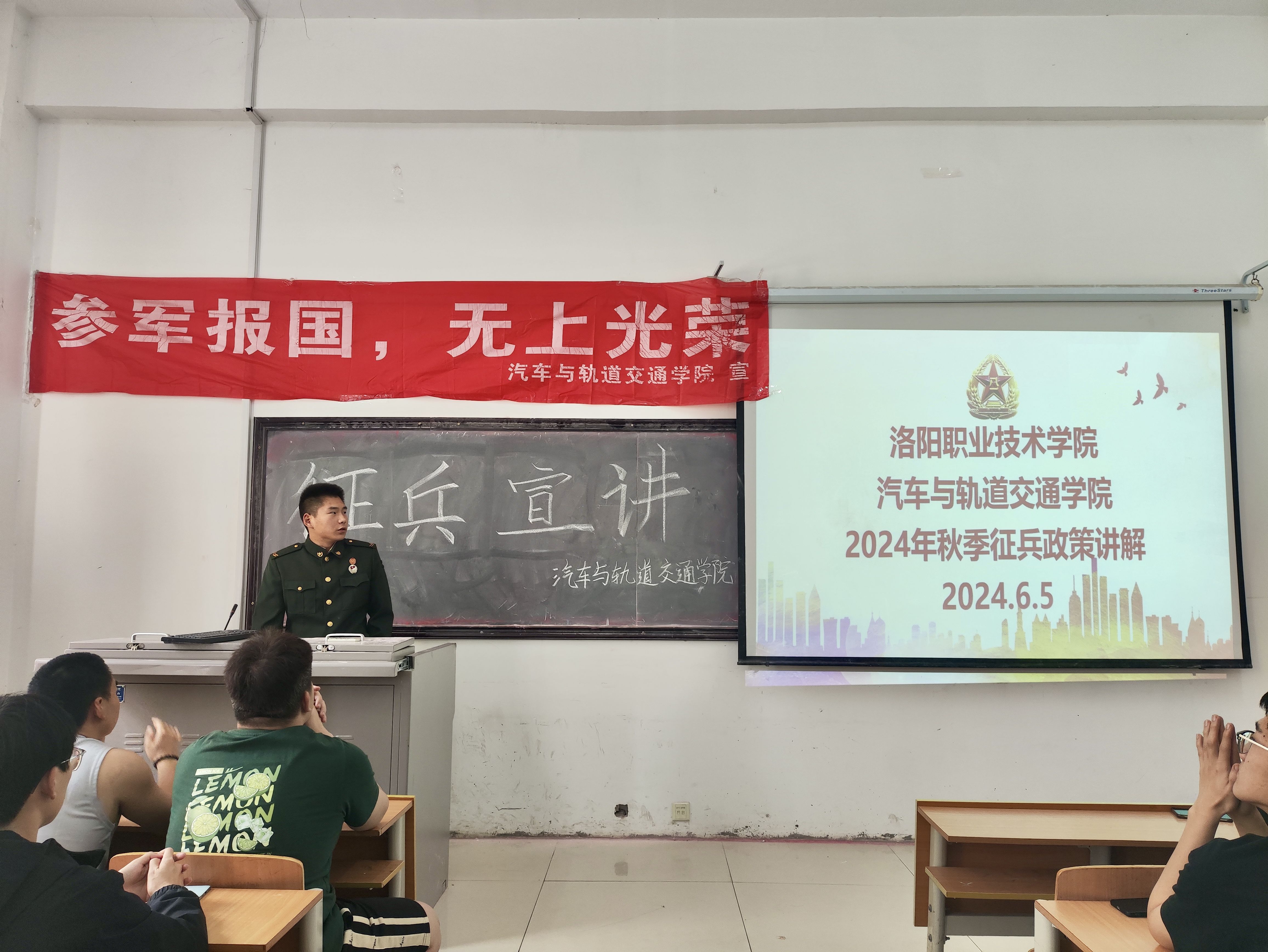 为了宣传国家征兵政策、增强国防意识和爱国主义精神。6月5日,汽车与轨道交通学院在综合楼102举办了征兵宣讲活动。汽车与轨道交通学院学工办主任王朋博、退役士兵郝金垚、各班有志投身国防事业的学生参加了此次讲座。