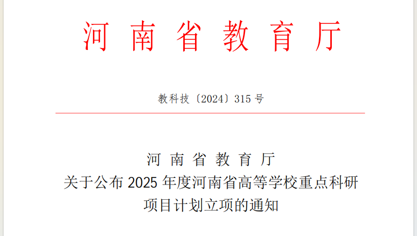 近日,河南省教育厅发布《关于公布2025年度河南省高等学校重点科研项目计划立项的通知》(教科技〔2024〕315号),我院杨柯博士、陈天骅博士申报的项目榜上有名,其中河南省高等学校重点科研项目资助项目1项、河南省高等学校重点科研项目指导项目1项,实现我院在该项目申请立项数量上的新突破!