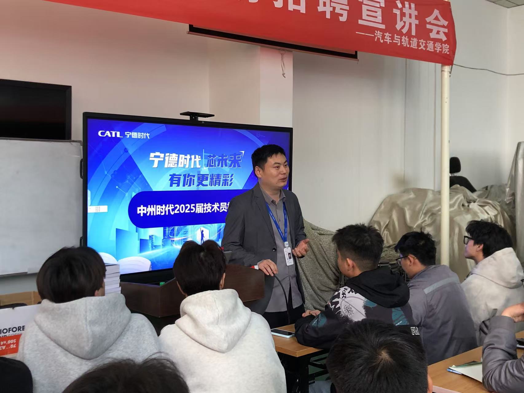 4月2日下午,宁德时代新能源科技股份有限公司旗下全资子公司——中州时代新能源科技有限公司在汽车与轨道交通学院汽车营销教室举办专场招聘宣讲会,面向2022级学生及2023级毕业生进行招聘。
