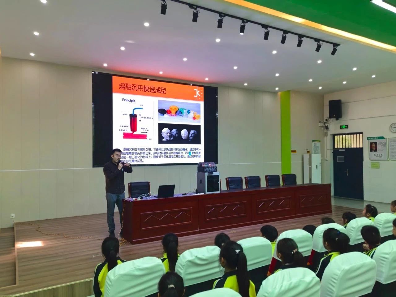 聘任仪式上,枫叶路小学党支部书记、校长宋光辉强调了科学副校长在架起职业教育与基础教育桥梁中的重要作用,期望通过科技创新课程培育新时代少年。聘任仪式结束后,杨柯博士以生动的语言和丰富的资料,向450名学生介绍了3D打印技术的起源、发展、原理及其在多领域的应用,并现场展示3D打印过程,与学生频繁互动。